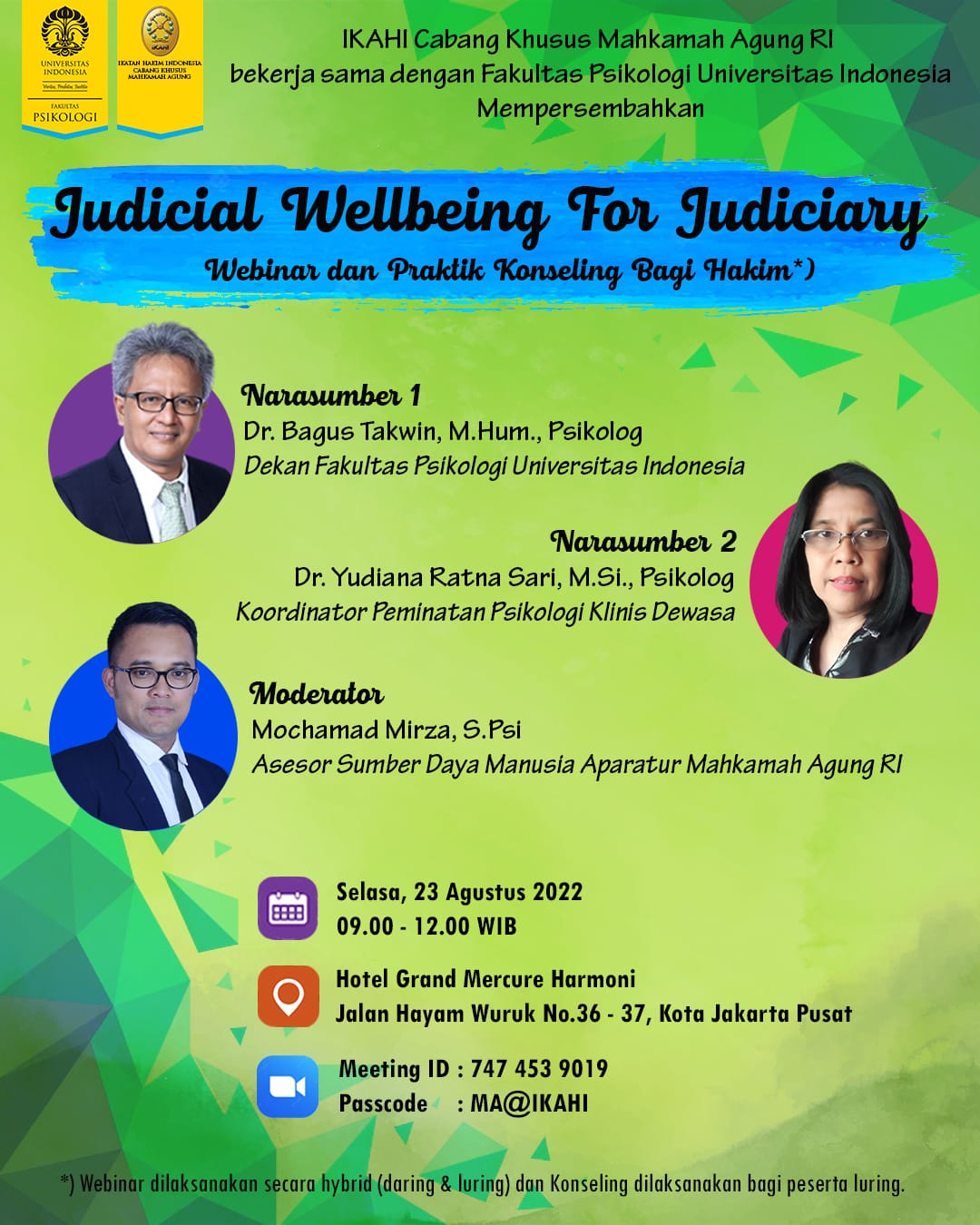 Jakarta – Humas : Dalam rangka Webinar dan Praktik Konseling Bagi Hakim dengan narasumber Dr. Bagus Takwin M.Hum (Psikolog) dan Dr. Yudiana Ratna Sari, M.Si (Psikolog), dengan ini kami mengundang Bapak / Ibu untuk mengikuti kegiatan tersebut.